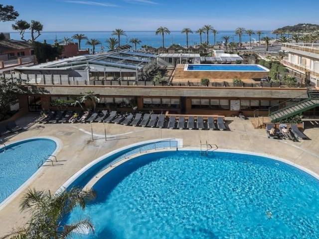 SITUACION: Hotel de 4 estrellas situado frente al mar, en una zona tranquila de Lloret de Mar. HABITACIONES: Dispone de 267 habitaciones en 2 edificios de 4 y 5 plantas entre habitaciones dobles estándard, dobles vista mar y suites junior estándard o vista mar ( dobles + salón ), disponen de baño completo, balcón, teléfono, secador de pelo, canal musical, A/A, Wifi gratis y T.V. vía satélite. Nevera gratis o minibar con paquete de bebidas de pago. Room services. Niños alojados en sofá-literas. SERVICIOS COMUNES: 3 piscinas ( 2 exteriores, una para adultos y una de niños y 1 piscina climatizada con agua marina y cubierta ). Pool-bar. Fitness and Spa center. Beauty salón. Salón de reuniones de empresa, salón lectura con area Wifi gratis. Salón Tv. Snack Bar. Bar café. NO se admiten animales. Tipo de servicio: Familiar, Spa, Hotel de playa, Primera linea de playa.