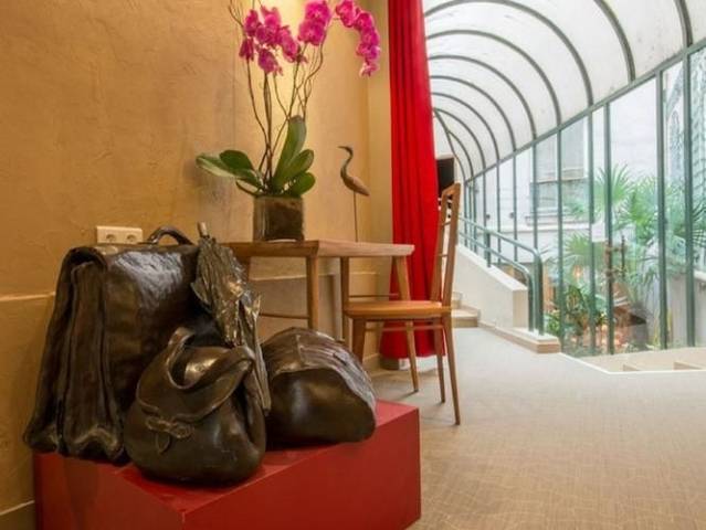 En la recepcin, nuestro solcito personal est a su servicio para darle toda la informacin que desee: visita de monumentos, transportes, reservas para espectculos o taxis, restaurantes que vale la pena descubrir, etc. En la recepcin dispone Usted de una caja fuerte. \n\n##Exterior\nEl hotel Moulin Plaza est al pie de la Butte Montmartre. Las pequeas calles empedradas, las panaderas de antao, las antiguas merceras y las terrazas de los cafs le aportan ese encanto singular. Este es desde hace siglos el lugar favorito de los artistas. Gracias al xito mundial de las pelculas Amlie Poulain y Moulin Rouge, Montmartre sigue siendo una de las principales atracciones de Paris. \n\n##Habitaciones\nTodas las habitaciones han sido renovadas, y disponen de minibar, televisin de pantalla LCD con cadenas francesas y extranjeras. Acceso WiFi a Internet gratuito. Cuartos de bao modernos revestidos en mrmol, con secador de pelo, ducha o baera.\n\n##Restaurante\nLa sala de desayuno se encuentra en el subsuelo del hotel y es muy acogedor, como paredes recubiertas con paneles de madera, cortinados y estatuas griegas.\n\n##Ubicacin\nEste hotel recientemente renovado situado al final de Butte Montmartre, ofrece alojamiento confortable en uno de los distritos ms famosos de Paris. El Moulin Plaza alberga 50 habitaciones en un rea de Pars que ha logrado conservar el encanto del pasado, mantenindose a la vez como uno de los barrios ms jvenes y animados de la ciudad. Famosas como lugar de encuentro de artistas, las terrazas de Montmartre le permitirn admirar el escenario pintoresco y encantador de este barrio. Esta rea de la Ciudad Luz es una de las ms apreciadas por su vida de comunidad. Aqu disfrutar de un ambiente acogedor y una situacin ideal para conocer la ciudad y todo lo que sta tiene que ofrecer.\n\n##Vestbulo\nEn el saln, decorado con esculturas, encontrar cmodos sillones. Es un lugar ideal para la distensin, con los amigos o la familia, despus de un da de compras, visitas tursticas o trabajo. Terminales con Internet y acceso WiFi gratuito.\n\n