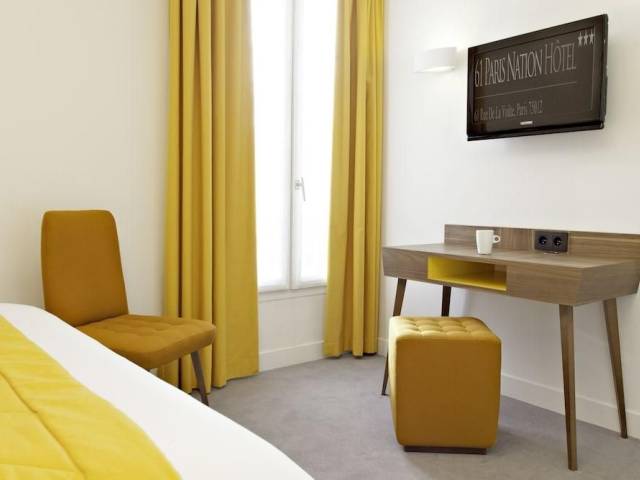 Las 47 habitaciones del hotel BW Plus 61 Paris Nation están perfectamente equipadas para una comodidad óptima : gran cama doble o dos twins, TV de pantalla plana con televisión satélite y canal+, WiFi gratuito, caja fuerte y mini-bar, insonorización, doble acristalamiento y climatización individual, cuarto de baño con ducha a la italiana, decorada con azulejos de imitación madera.