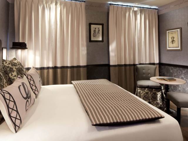 El Hotel Les Plumes le invita a un apasionante viaje en el tiempo, al corazón del romántico París del siglo XIX y al descubrimiento de las míticas parejas que marcaron este periodo rico en obras maestras. Sobre las huellas de Paul Verlaine y Arthur Rimbaud, de Victor Hugo y Juliette Drouet o incluso de George Sand y Alfred de Musset, disfrutará de la atmósfera típica de una casa de huéspedes de la época en la cual todo, desde los disfraces del personal a los refinados detalles decorativos, le sumergirá en el ambiente deliciosamente romántico de entonces. Disfrutará de la dimensión lúdica de este original lugar que mezcla guiños históricos y comodidades modernas; pero también podrá disfrutar de la dimensión decididamente confortable del hotel y de sus 35 habitaciones y suites, que se prestan tanto a escapadas turísticas como a viajes de negocios.