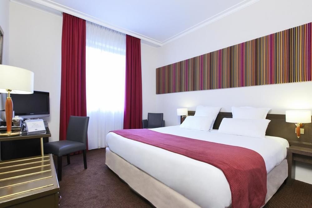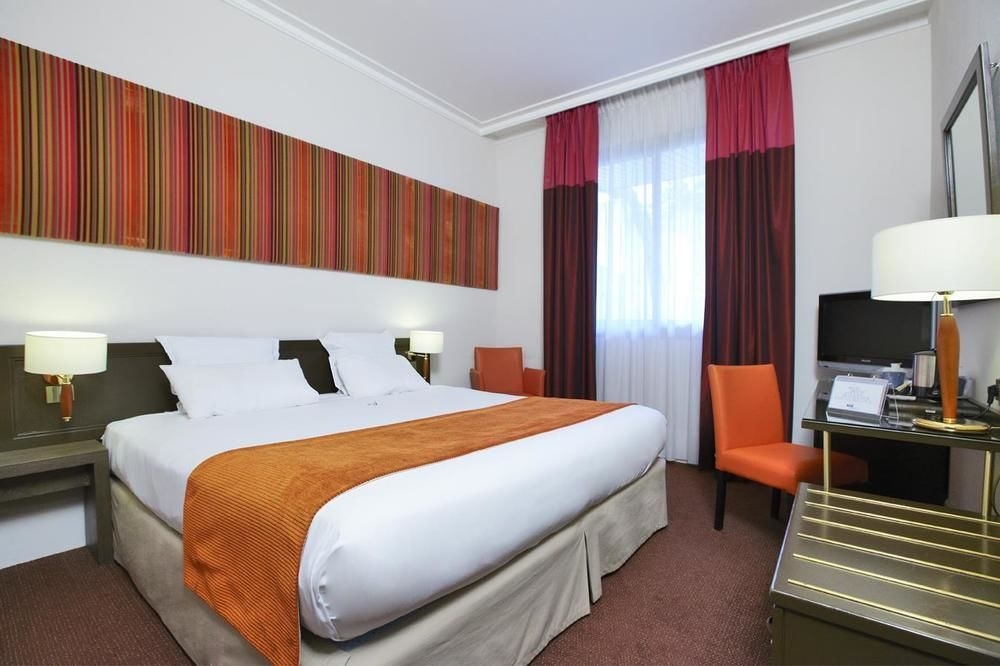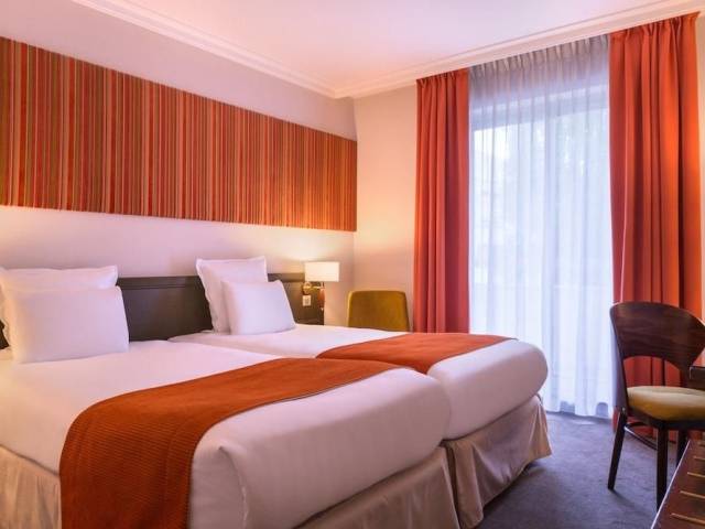 Este moderno hotel situado en una zona residencial del centro de París, Port de Saint Cloud e inmediaciones de La Défense, está cerca del jardín de Alber-Kahn (300 m), de los bosques de Boulogne (500 m), de los jardines reales (1,5 km) y del centro de exposiciones Port de Versailles. Cerca tiene también transporte público, a 20 Km está el aeropuerto de Orly y el de Charles de Gaulle está a 40 Km.SE trata de un edificio climatizado con 6 plantas y 75 habitaciones dobles, vestíbulo con recepción 24 horas, ascensor, cambio de divisa, servicio de fotocopiadora, el restaurante Les 4 Saison, bar, cafetería, 5 salas de conferencias con capacidad para 130 personas, servicio de lavandería y de tintorería, conexión a Internet WLAN y garage subterráneo de pago.En 29 habitaciones doble shay camas de matrimonio, mientras que 46 tienen 2 camas separadas. Todas tienen, por lo demás, baño con secador de pelo, teléfono de línea directa, TV vía satélite o por cable, equipo de música, Internet de alta velocidad, mini bar, set de plancha, caja fuerte y, si lo desea, podrá reservas camas gratis para niños menores de 12 años, calefacción, aire acondicionado regulable y balcón o terraza.Hay además, el estadio de Rolland Garros, una pista para correr, Versailles y Disneyland.Se puede reservar en régimen de pensión completa o alojamiento más desayuno. El desayuno se sirve como bufé continental, el almuerzo también, aunque éste y la cena puede pedirse a la carta o como menú.Si toma el metro d ela línea 10 y para en Boulogne Billancourt, estará ya; pero también con los buses 62 y 72.
