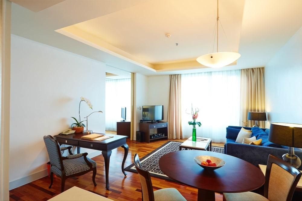 Este hotel se encuentra en la calle Langsuan, en el corazón del distrito central de negocios. Además, está cerca de las embajadas principales y en una zona famosa por sus restaurantes, tiendas, entretenimiento y por su mercado nocturno. Se encuentra a solo 10 minutos a pie del tren elevado de Bangkok, mientras que el parque de Limpinee está a 20 minutos a pie o 5 minutos de trayecto desde el hotel. El aeropuerto internacional de Don Mueang está a 25 km y el aeropuerto de Suvarnabhumi, a 35 km.Este hotel urbano climatizado dispone de un centro de negocios totalmente equipado y de la cafetería parisina Lenotre, mundialmente conocida. Además, cuenta con vestíbulo con recepción 24 horas, caja fuerte, ascensor, restaurante, servicio de habitaciones y de lavandería, así como aparcamiento.El hotel ofrece apartamentos modernos, elegantes, espaciosos y, sobre todo, confortables. Todas las habitaciones tienen camas extra grandes con edredones y aire acondicionado regulable. Los cuartos de baño disponen de ducha y bañera separadas (excepto los estudios). Todas las habitaciones están dotadas, además, de secador de pelo, teléfono de línea directa, TV vía satélite/por cable, radio, caja fuerte, conexión a Internet y cocina con nevera, minibar, horno, microondas, set de plancha, cafetera y tetera. Hay habitaciones de no fumadores disponibles.Podrá disfrutar del spa, gimnasio y piscina al aire libre con tumbonas y sombrillas, además de la bañera de hidromasaje, sauna, solárium y del servicio de masajes.