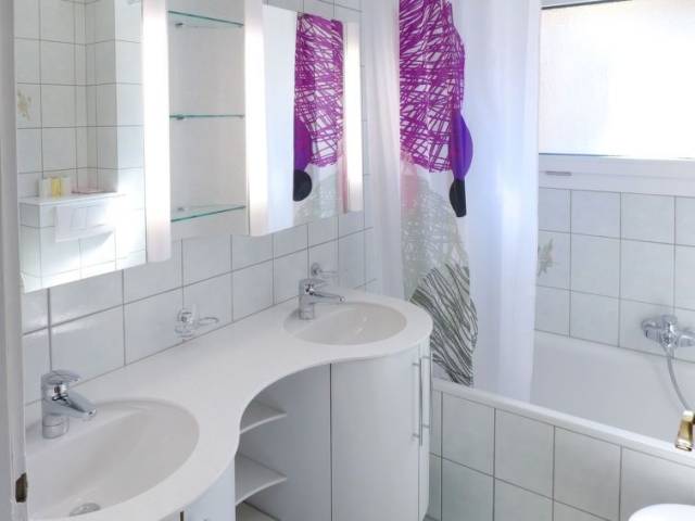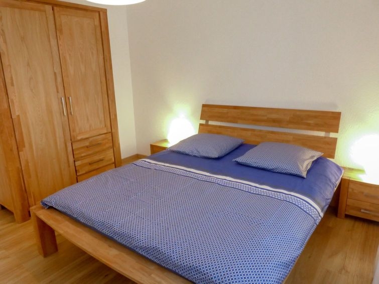 Apartamento de 4 estancias 100 m2, en planta baja elevada. Completamente reformado en 2016, con mobiliario bonito: salón-comedor con TV cable, pantalla plana, vídeo, radio y CD. 1 dorm. con 1 cama de matrimonio (180 cm, 200 cm de longitud), TV cable (pantalla plana). Salida al balcón, orientación sur. 1 dorm. con 1 cama de matrimonio (180 cm, 200 cm de longitud). 1 dorm. para niños con 2 x 2 literas (90 cm, 190 cm de longitud). Cocina (horno, lavavajillas, 4 placas de vitrocerámica, tostadora, hervidor de agua eléctrico, microondas, cafetera eléctrica, Cápsulas de café (Nespresso) extra, horno Raclette, set de Fondue (chinoise, queso)) con mesa de comedor. Baño/WC, ducha/WC, doble lavabo. Balcón grande, orientación sur. Muebles de balcón, tumbonas (2). Vista a las montañas y al paisaje. El alojamiento dispone de: plancha, secador de pelo. Internet (Wifi, gratis). Garaje n. 26 a 15 m, altura 200 cm, ancho 230 cm. A tener en cuenta: apartamento para no fumadores.