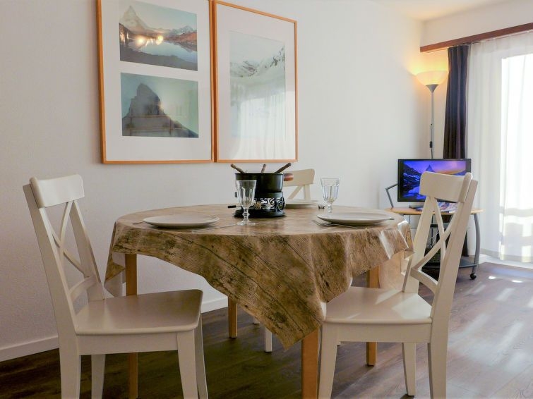 Estudio 35 m2 en el 2° piso, orientación sur. Luminoso, con mobiliario sencillo y agradable: salón-dormitorio con 1 sofá-cama (90 cm, 200 cm de longitud), 1 cama doble (160 cm, 200 cm de longitud), mesa de comedor y TV. Salida al balcón. Cocina abierta (horno, 4 placas de vitrocerámica, tostadora, hervidor de agua eléctrico, congelador, cafetera eléctrica, horno Raclette, set de Fondue (queso)). Baño/WC. Balcón 7 m2, orientación sur. Muebles de balcón. Vista bonita Matterhorn. El alojamiento dispone de: secador de pelo. A tener en cuenta: apartamento para no fumadores.
