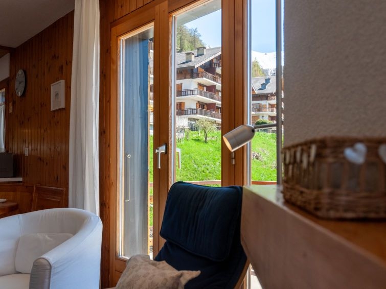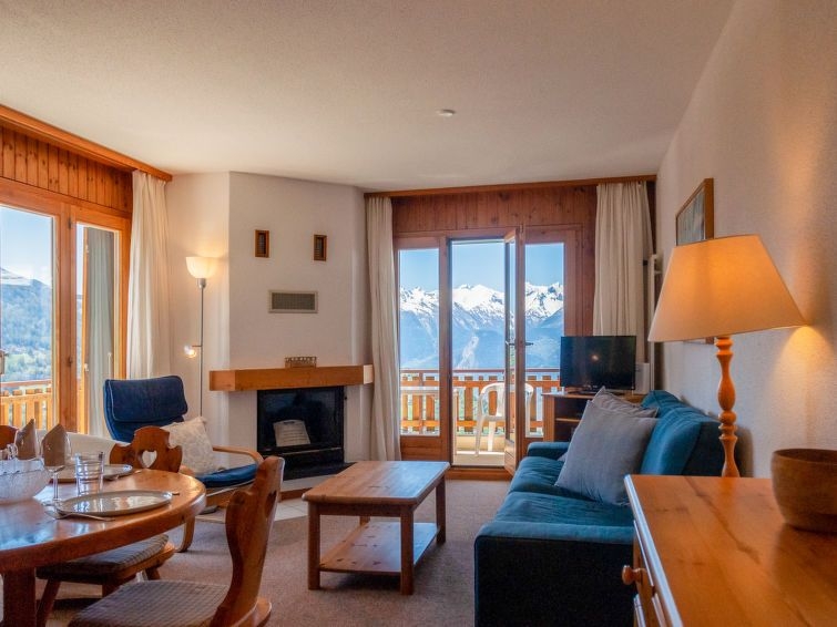 Apartamento de 4 estancias 80 m2. Con mobiliario confortable y bonito: salón-comedor con chimenea (sólo con función decorativa), TV cable. Salida al balcón. 2 dorm., cada habitación con 2 camas dobles (2 x 90 cm, 190 cm de longitud). 1 dorm. con 2 camas (80 cm, 190 cm de longitud), baño/WC. Cocina abierta (horno, lavavajillas, 4 placas de vitrocerámica, hervidor de agua eléctrico, microondas, cafetera eléctrica, horno Raclette, set de Fondue (queso)). Ducha/WC. Balcón grande, orientación oeste balcón grande, orientación sur y orientación este. Vista panorámica espléndida a las montañas y al valle. El alojamiento dispone de: Internet (Wifi, gratis). A tener en cuenta: apartamento para no fumadores, sin aparcamiento.