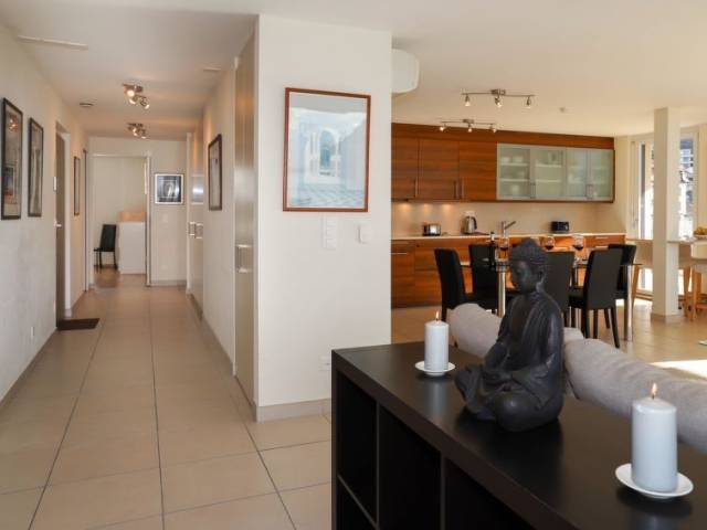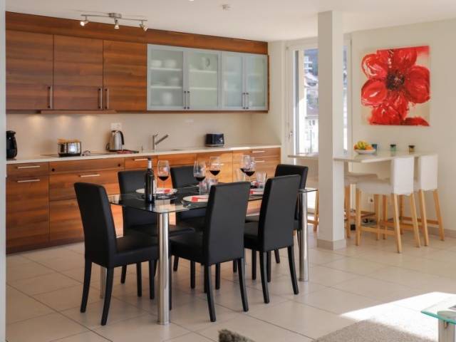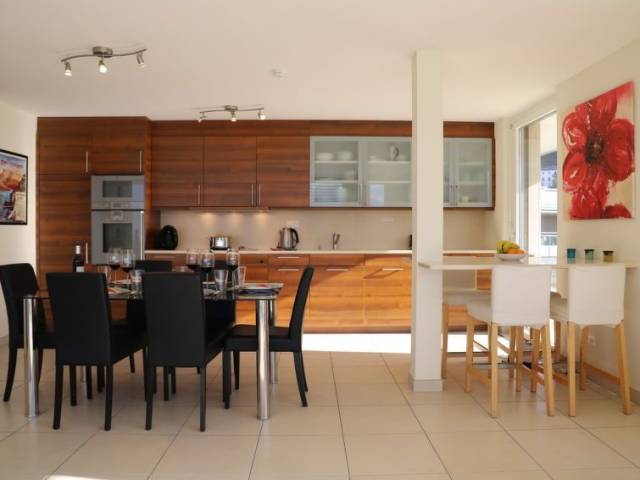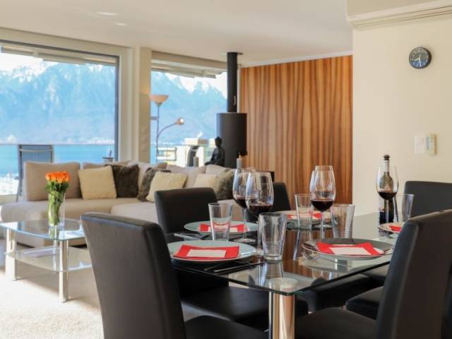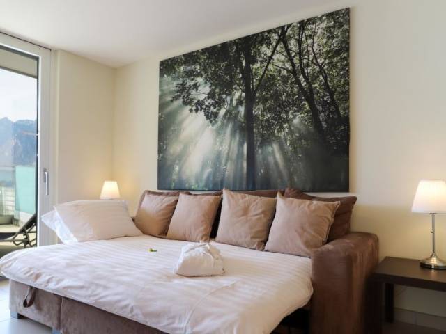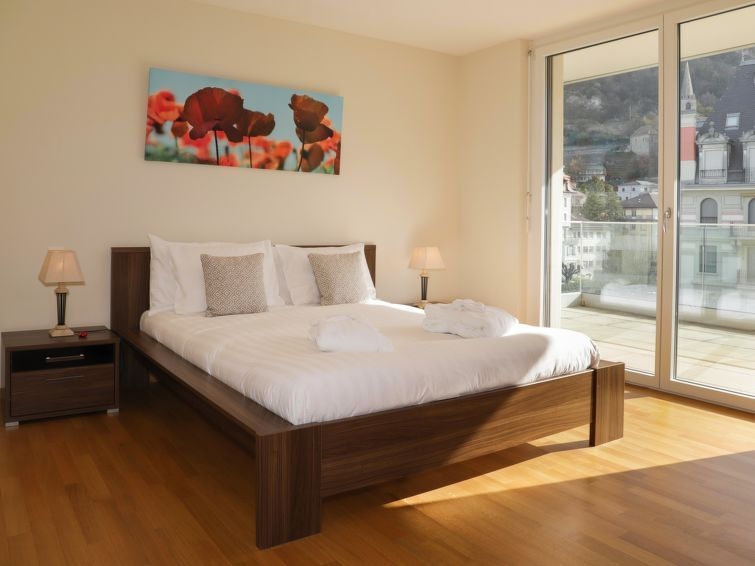 "L'Esplanade A6.14", apartamento de 3 estancias 137 m2, en el ático. Con mobiliario lujoso y de buen gusto: salón-comedor abierto grande con chiminea nórdica, TV cable y aire acondicionado. Salida a la terraza. 1 dorm., grande con 1 cama doble (180 cm, 200 cm de longitud), baño/ducha/WC y aire acondicionado. Salida a la terraza. 1 dorm., grande con 2 camas (90 cm, 200 cm de longitud), baño/ducha/WC y aire acondicionado. Salida a la terraza. 1 dorm., abierto pequeño con puerta corredera con 1 sofá-cama doble (140 cm, 200 cm de longitud). Cocina abierta (horno, lavavajillas, 4 placas de vitrocerámica, tostadora, hervidor de agua eléctrico, microondas, congelador, cafetera eléctrica, Cápsulas de café (Bosch Tassimo) extra) con mesa de comedor. Ducha/WC. Calefacción de gas, calefacción por el suelo. Terraza grande 98 m2. Muebles de terraza, tumbonas (3). Vista panorámica espléndida al lago, a las montañas, al paisaje y a la localidad. El alojamiento dispone de: lavadora, secadora. Internet (Wifi, gratis). Garaje n. 83 en el mismo terreno. A tener en cuenta: apartamento para no fumadores, aparcamiento para coches pequeños.