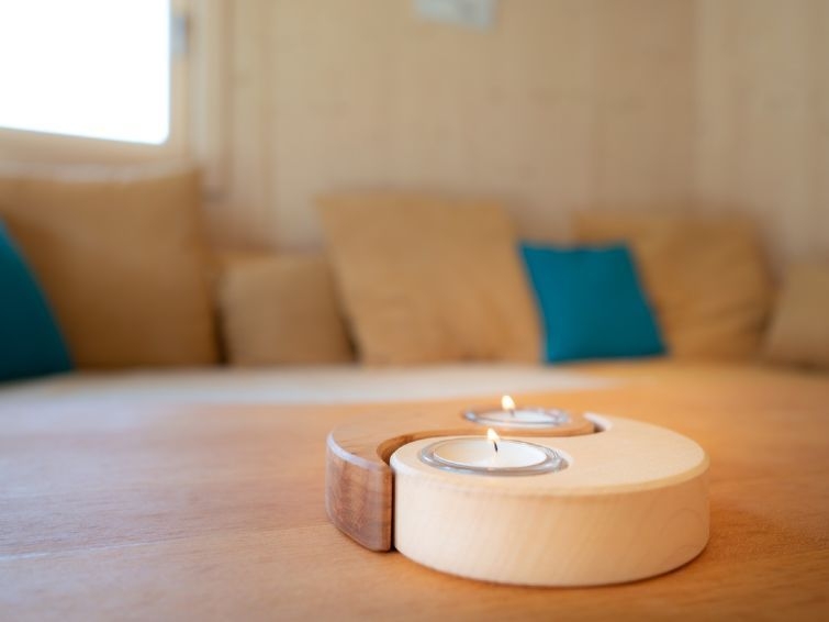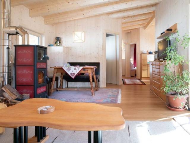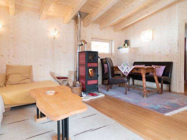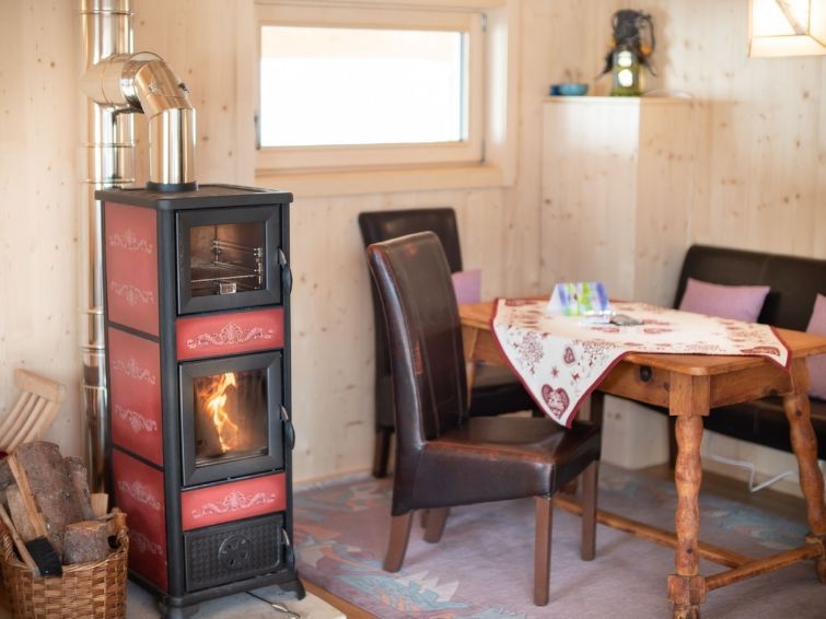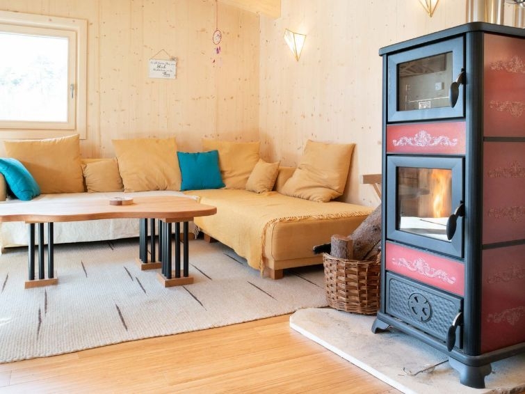 Chalet de madera 3 estancias 65 m2, en planta baja elevada. Con mobiliario agradable y con mucha madera: 1 dorm. doble. 1 dorm. con 2 camas y 2 camas-nido (190 cm de longitud). Salón con 1 sofá-cama doble, chiminea nórdica, mesa de comedor y pantalla plana. Salida a la terraza. Cocina abierta (4 fogones, horno, lavavajillas). Ducha/WC. Terraza grande 20 m2, cubierta, orientación sur y orientación oeste. Muebles de terraza. Vista espléndida al paisaje. El alojamiento dispone de: trona, cuna, secador de pelo. Internet (Wifi). A tener en cuenta: casa para no fumadores. Detector de humo.