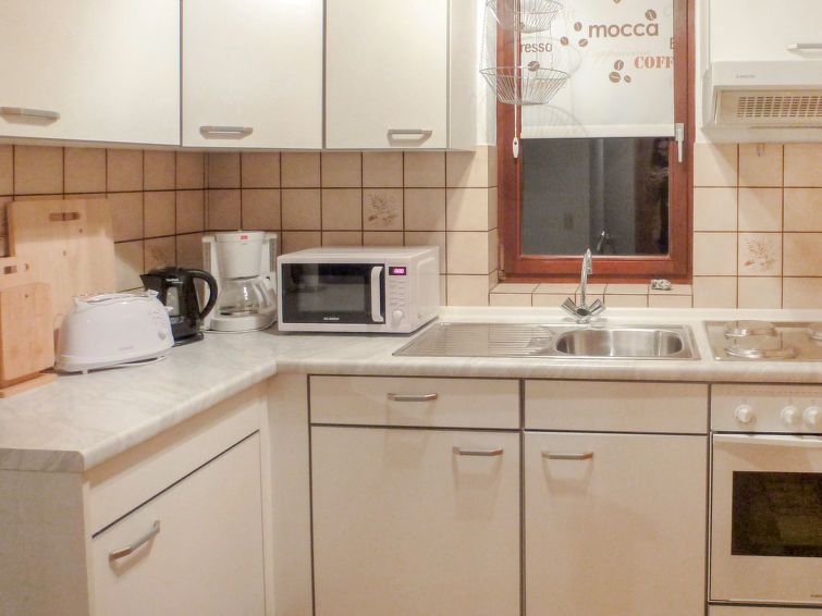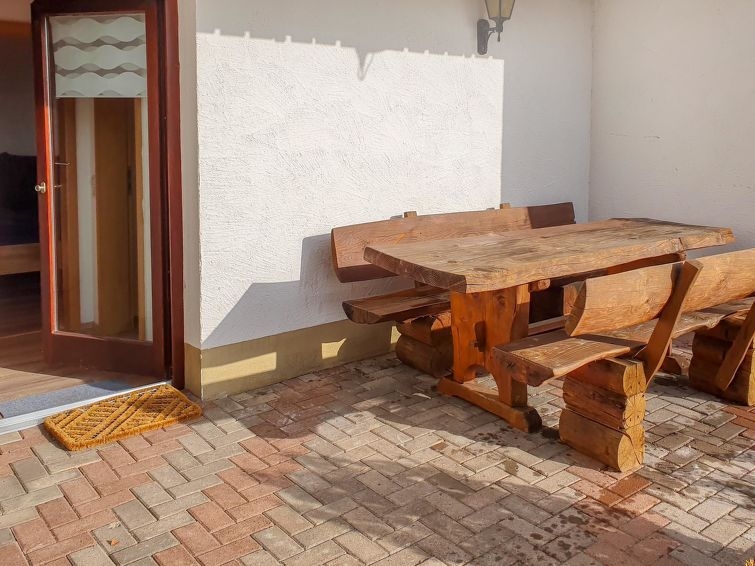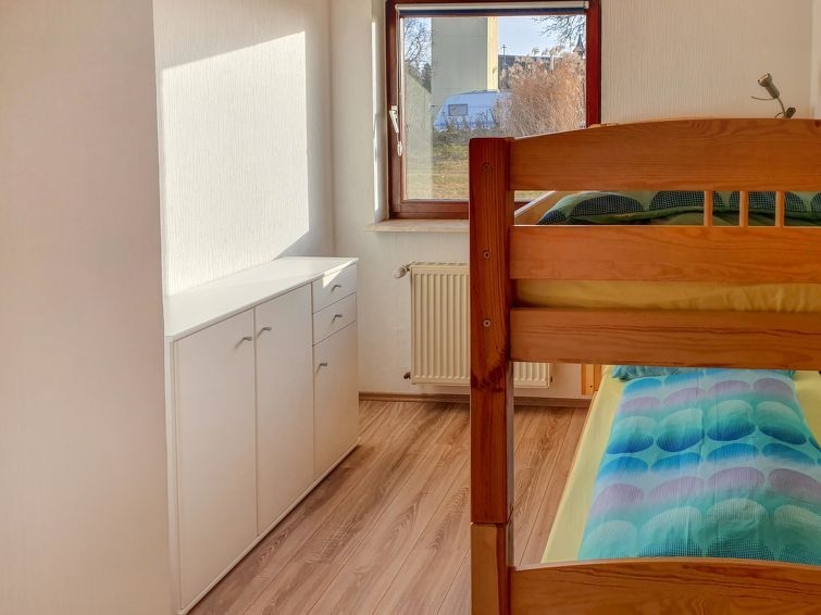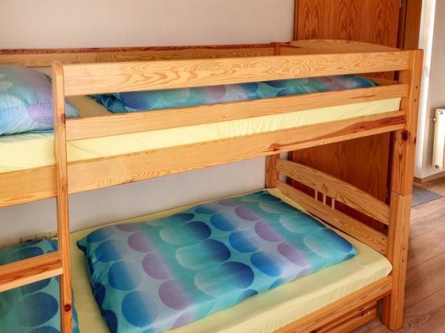 Apartamento de 3 estancias 50 m2, en planta baja. Salón-comedor con TV satélite (pantalla plana), radio. 1 dorm. con 1 cama doble (2 x 90 cm, 200 cm de longitud). 1 dorm. con 1 x 2 literas (90 cm, 200 cm de longitud). Rincón-cocina (4 fogones, horno, microondas, cafetera eléctrica). Ducha/WC. Terraza 15 m2, cubierta. Muebles de terraza, trastero. El alojamiento dispone de: lavadora, cuna hasta 2 años, secador de pelo. Internet (Wifi, gratis). A tener en cuenta: apartamento para no fumadores. Entrada privada.