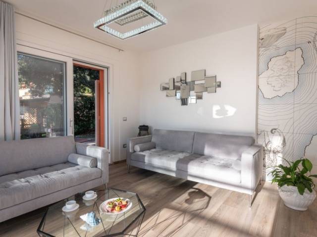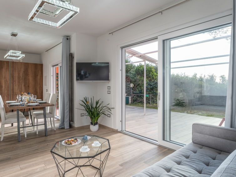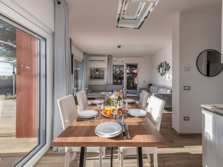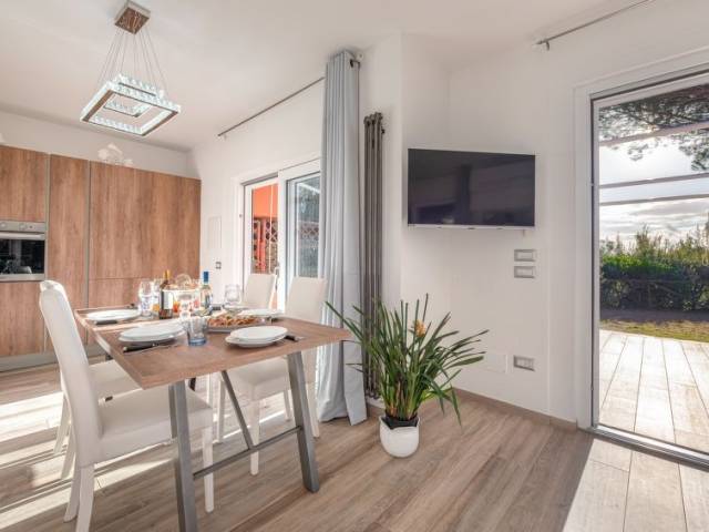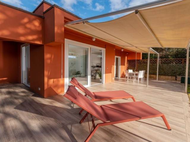 "Villa Marzia Mare & Golf", casa 5 estancias 120 m2. Espacioso y luminoso, completamente reformada en 2022, con mobiliario muy moderno y de estilo: salón-comedor con ventanal con TV (pantalla plana), aire acondicionado. Salida al jardín, a la terraza. 2 dorm. dobles, cada habitación con TV (pantalla plana), aire acondicionado. Salida al jardín, a la terraza. 1 dorm. con 2 camas (80 cm), TV (pantalla plana), aire acondicionado. Salida al jardín. 1 dorm. doble con TV (pantalla plana), aire acondicionado. Cocina abierta (horno, lavavajillas, Estufa de gas, 5 fuegos, tostadora, hervidor de agua eléctrico, microondas, cafetera eléctrica) con mesa de comedor. Salida a la terraza. 2 ducha/bidet/WC. Calefacción de gas, aire acondicionado. Suelo de piedra natural. Terraza grande parcialmente cubierta, terraza-jardín. Muebles de terraza, muebles de balcón, barbacoa, tumbonas. Vista panorámica espléndida al mar. El alojamiento dispone de: lavadora, plancha, mosquitera, trona, cuna hasta 2 años, secador de pelo. Internet (Wifi, gratis). Plaza de aparcamiento (vallada, 4 Coches) junto a la casa. A tener en cuenta: apartamento para no fumadores.