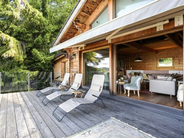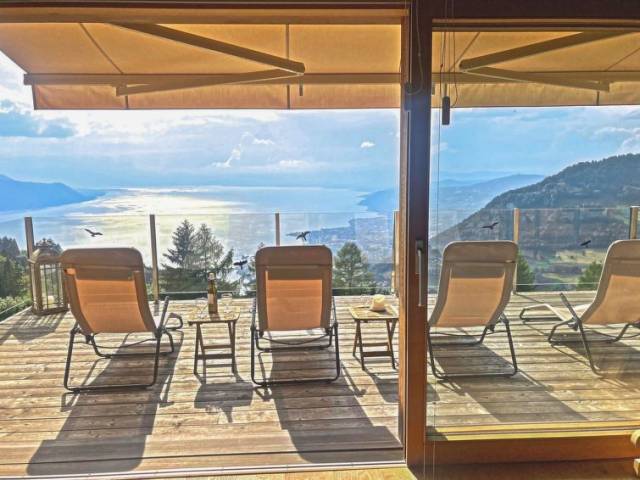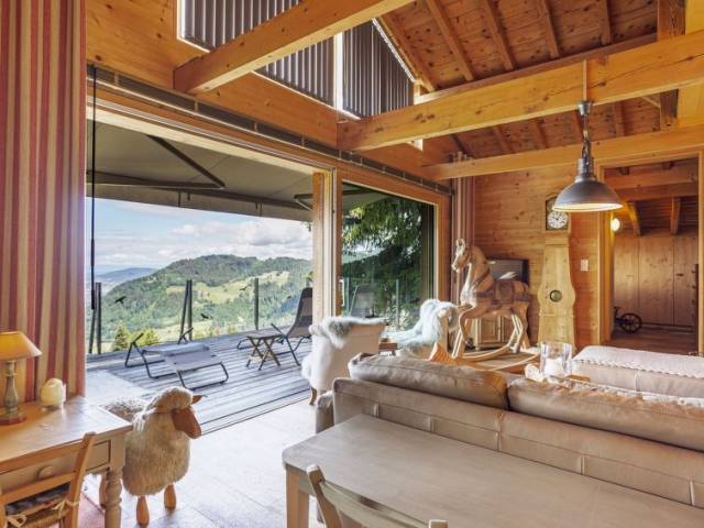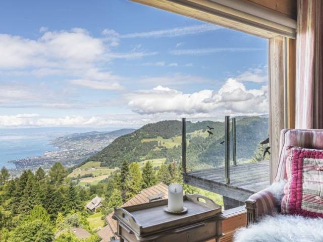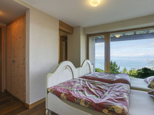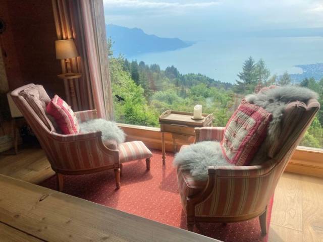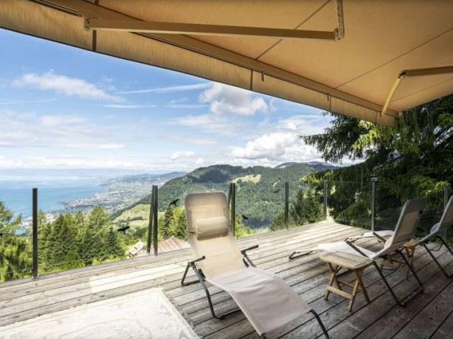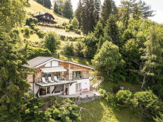 Haut de Caux a 11 km de Montreux: Chalet tipo suizo "Coin de Paradis", 1'150 m s.n. m., muy bonito, lujoso de 2 plantas, rodeado de árboles y prados. Lugar tranquilo, soleado en una pendiente, a 10 m de un bosque, en el campo, orientación suroeste. En el inmueble: calefacción central. 20 m camino hasta la casa. Aparcamiento a 50 m. Tienda de comestibles 5 km, supermercado 11 km, centro comercial 11 km, restaurante 270 m, estación de tren "Haut de Caux" 400 m, lago Lac Léman 12 km. Atracciones en los alrededores: Montreux 11 km, Château de Chillon 9 km, Chaplin's World 17 km, Musée de la vigne et du vin, Aigle 24 km, Le Musée Olympique, Lausanne 35 km. Zonas de esquí populares fácilmente accesibles: Rochers de Naye. Lagos conocidos fácilmente accesibles: Lac Léman 11 km. Zona de senderismo Rochers de Naye. A tener en cuenta: adecuado para familias. El propietario no acepta grupos de adolescentes/jóvenes. Vías del tren en la proximidad 400 m de la casa. "Chalet Coin de Paradis", chalet de madera 5 estancias en 2 plantas, orientación suroeste. Con mobiliario lujoso y con mucha madera: salón-comedor grande con chimenea (sólo con función decorativa), TV. Salida a la terraza. Grande cocina abierta (lavavajillas, 4 Placas de inducción, tostadora, hervidor de agua eléctrico, cafetera eléctrica, set de Fondue (queso)). WC separado. En planta inferior: 1 dorm. con 1 cama de matrimonio (140 cm, 200 cm de longitud), lavabo, WC separado y ducha. 1 dorm. con 2 x 2 literas (90 cm, 200 cm de longitud). Salón-comedor. Salida a la terraza. 1 dorm. con ventanal con 2 camas (90 cm, 200 cm de longitud), lavabo y ducha. Salida a la terraza. Cocina abierta (4 fogones, horno, hervidor de agua eléctrico, cafetera eléctrica, Cápsulas de café (Nespresso)). Ducha/WC, WC separado. Terraza grande. Muebles de terraza. Vista panorámica espléndida al lago, a las montañas, al valle, al paisaje y a la localidad. El alojamiento dispone de: trona, cuna hasta 2 años (extra), secador de pelo. Internet (Wifi). Plaza de aparcamiento a 50 m. A tener en cuenta: apartamento para no fumadores. Permitido máximo 1 mascota / perro.