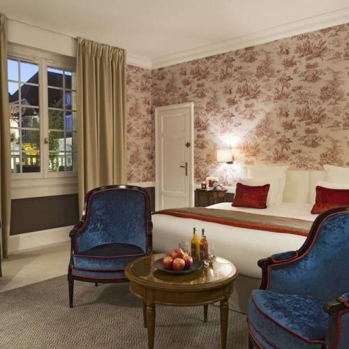 Rouffach, FranciaEl hotel está situado en la ruta del vino de Alsacia, en el corazón de los viñedos, a varios kilómetros de Colmar. Domina el casco antiguo de Rouffach y ofrece una magnífica panorámica de las estribaciones de Vosges, la llanura del Rin y la Selva Negra en la distancia. El centro de la ciudad está a solo 500 m. La estación de trenes más cercana está a unos 15 minutos de trayecto y las zonas de esquí quedan a unos 45 minutos de coche.El castillo, construido sobre bodegas abovedadas de los siglos XII y XIV, rememora los tiempos de Dagobert y Carlomagno y su agitada historia. Se trata de un encantador hotel de 41 habitaciones y complejo spa en el que disfrutar de un ambiente refinado y de relajación. Es el lugar ideal para hacer una parada y descubrir Alsacia y su gastronomía. El hotel tiene aire acondicionado y dispone de vestíbulo con servicio de salida y recepción 24 horas, caja fuerte, servicio de cambio de divisas, guardarropa, ascensor, servicio de lavandería, bar, restaurante, servicio de habitaciones, instalaciones para conferencias y, por un cargo extra, conexión a Internet, aparcamiento y alquiler de bicicletas.Todas las habitaciones están decoradas con elegancia y ofrecen todas las comodidades de hoy. Ofrecen vistas al jardín lleno de árboles, el parque, el viñedo o la llanura de Alsacia. Las habitaciones disponen de cama doble o dos camas individuales, cuarto de baño con WC separado, aire acondicionado, conexión a Internet WiFi, TV de pantalla plana, minibar, set de plancha, secador de pelo, calefacción central y aire acondicionado regulable.