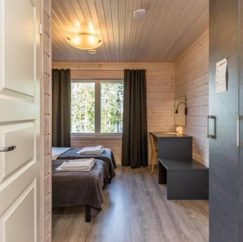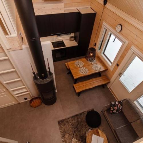 Inari, FinlandiaApartamento en planta alta en una casa adosada de 2 plantas en el centro de Saariselkä. A poca distancia de restaurantes, tiendas y pista de esquí de fondo. Entrada al apartamento está a nivel de calle. Apartamento tiene cocina-salón con sofá-cama (140x190 cm), 2 dormitorios con 2 camas cada uno, sauna eléctrica, cuarto de ducha/aseo, aseo y balcón. Aire acondicionado mecánico en el apartamento. Las características incluyen también un gran conjunto de cubiertos y utensilios de cocina, cafetera, hervidor de agua, tostadora, batidora de mano y plancha y tabla de planchar, secador de pelo. Cuarto de mantenimiento de esquís con una mesa para encerar los esquís y un pequeño almacén para la leña. La leña no está incluida en verano.