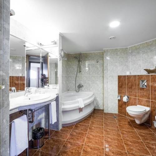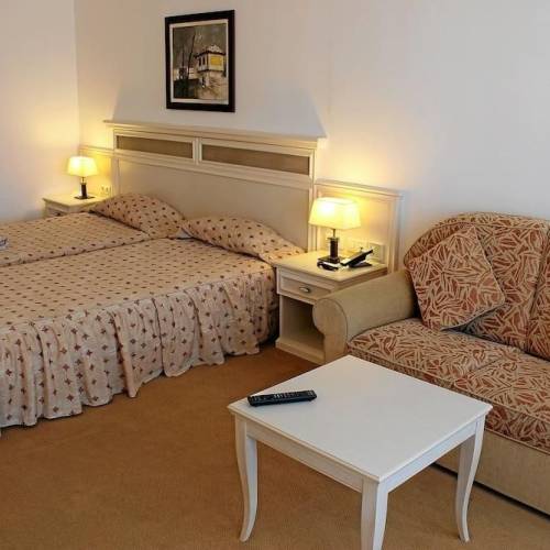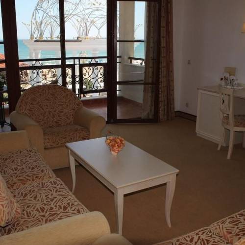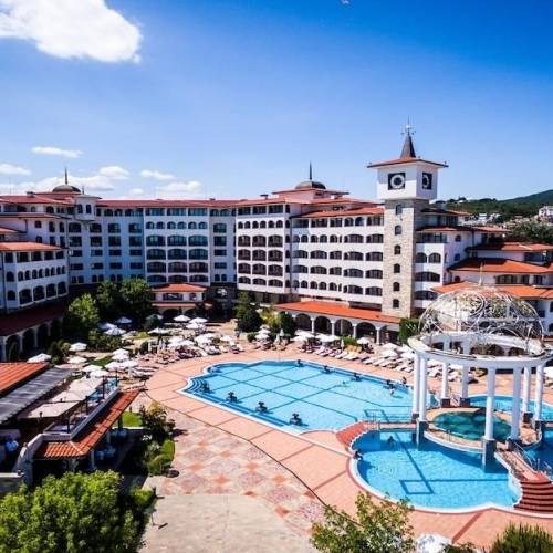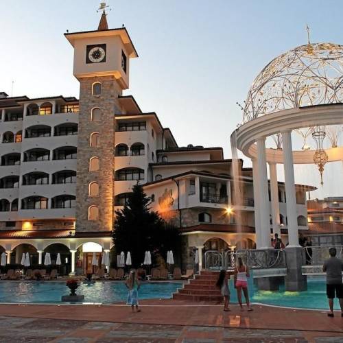 Slanchev Bryag, BulgariaEl hotel está rodeado por un hermoso jardín con un arroyo natural y puentes pictorescos y su arquitectura lleva el espíritu del renacimiento búlgaro. Las instalaciones del hotel incluyen: restaurante con sección para no fumadores y terraza, restaurante italiano, piano bar, snack bar junto a la piscina andamp; barbacoa, bar de playa y una piscina. Hay un miniclub y un parque infantil.