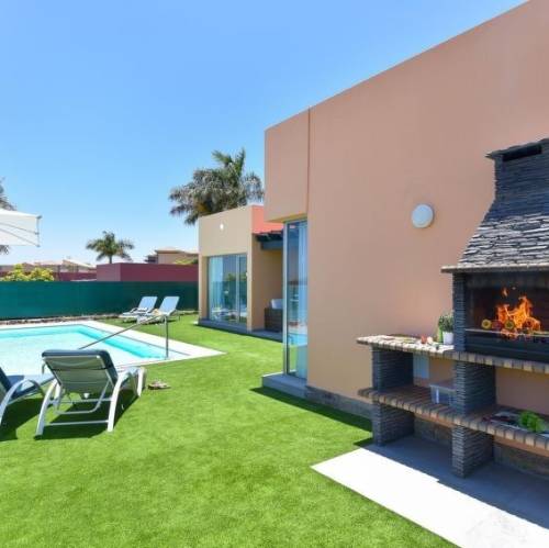 Maspalomas, EspañaVilla "Par 4 Villa 9 with Pool Salobre", moderna, confortable. En el centro de Salobre Golf Resort, en la periferia Maspalomas 5 km, en las afueras de la localidad Meloneras 7 km, lugar tranquilo, soleado, elevado. Privado: jardín (vallado) con césped 80 m2, piscina rectangular (8 x 4 m, 140 - 140 cm de profundidad, Disponible por temporada: 01.Ene. - 31.Dic.). Barbacoa. En el inmueble: solarium, aire acondicionado. Aparcamiento en el mismo terreno, posibilidad de aparcamiento en la calle. Tienda 4 km, supermercado 3 km, restaurante 200 m, playa de arena 10 km. Campo de golf 50 m. A tener en cuenta: coche recomendable. El propietario no acepta grupos de adolescentes/jóvenes. Aeropuerto 40 km de la casa. Vecindario muy sensible a ruidos. Se ruega respetar la tranquilidad y normas de buen comportamiento. "P9", casa 4 estancias 115 m2. Con mobiliario confortable y moderno: salón con TV satélite, TV digital, vídeo, equipo de música, DVD y aire acondicionado. Salida a la terraza-jardín. 1 dorm. con 1 cama de matrimonio, ducha/WC y aire acondicionado. Salida al jardín. 2 dorm., cada habitación con 2 camas y aire acondicionado. Cocina abierta (horno, lavavajillas, tostadora, hervidor de agua eléctrico, microondas, congelador, cafetera eléctrica) con mesa de comedor, aire acondicionado. Ducha/WC. Terraza-jardín. Muebles de terraza, barbacoa. Vista a las montañas y a la localidad. El alojamiento dispone de: lavadora, secadora, caja fuerte, plancha, trona, cuna hasta 2 años, secador de pelo. Internet (Wifi, gratis). Plaza de aparcamiento (1 coche). A tener en cuenta: casa para no fumadores. Permitido máximo 1 mascota / perro. 2019/4522