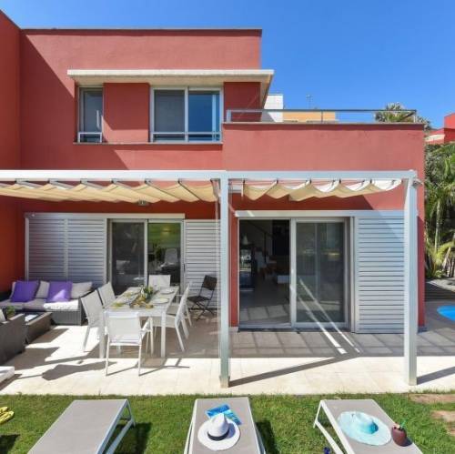Maspalomas, EspañaCasa adosada "Villa Curie Sonnenland", amplia, agradable. En el centro de Sonnenland, lugar tranquilo, soleado. Privado: terreno (vallada), piscina rectangular (8 x 3 m, 140 - 140 cm de profundidad, Disponible por temporada: 01.Ene. - 31.Dic.). Barbacoa. En el inmueble: aire acondicionado. Aparcamiento en el mismo terreno, posibilidad de aparcamiento en la calle. El propietario no acepta grupos de adolescentes/jóvenes. Vecindario muy sensible a ruidos. Se ruega respetar la tranquilidad y normas de buen comportamiento. "CURIE", casa 5 estancias 240 m2. Con mobiliario confortable y agradable: salón-comedor con mesa de comedor, TV satélite y TV digital. Salida a la terraza. Cocina (horno, 4 placas de vitrocerámica, tostadora, hervidor de agua eléctrico, microondas, congelador, cafetera eléctrica). WC separado. Planta superior: 1 dorm. con 1 cama de matrimonio y baño/WC. 2 dorm., cada habitación con 1 cama de matrimonio. 1 dorm. con 2 camas. 2 ducha/WC. Terraza. Muebles de terraza, barbacoa, tumbonas. El alojamiento dispone de: lavadora, secadora, caja fuerte, plancha, trona, cuna hasta 2 años, secador de pelo. Internet (Wifi, gratis). Plaza de aparcamiento (1 coche). A tener en cuenta: casa para no fumadores. Permitido máximo 1 mascota / perro. 2019/483