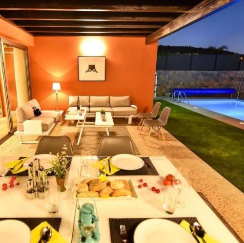 Maspalomas, EspañaVilla, amplia, moderna, lujosa "Majestic Villa Monte Leon for 6 + 6". Equipamiento de la vivienda: aire acondicionado, solarium, lavadora (privado). Parking: garaje individual. Acceso en coche todo el año. Situación: lugar aislado, tranquilo, soleado. Vista desde la vivienda a las montañas y al paisaje. Entorno de la vivienda: terreno (privado, 7'200 m2, vallado), piscina (privado), barbacoa (privado). Las llegadas tardías deberán abonar un coste extra en efectivo: 20:30-22:00: 30€, 22:00-00:00: 50€, 00:00-01:30: 80€. Calefacción de la piscina (extra) 80.00 al día a pagar al llegar. Obligatorio solicitarla en el momento de la reserva. Casa 6 piezas para 6 personas, 420 m2 en 2 plantas, con mobiliario moderno y lujoso. Salón con TV regional y TV satélite. Fumar no permitido. Internet (Wifi). Dormitorio con 1 cama doble. Dormitorio con 2 camas individuales. Dormitorio con 2 camas individuales. Cocina con 4 quemadores, microondas, horno, lavavajillas, frigorifico y congelador. Ducha/WC y WC separado. Terraza, muebles de terraza. Otros equipamientos: caja fuerte, trona, secador de pelo, plancha, lavadora. Wi-Fi (extra: 6€/día), a pagar en plaza. 2019-T2580