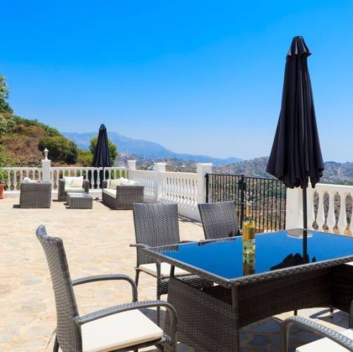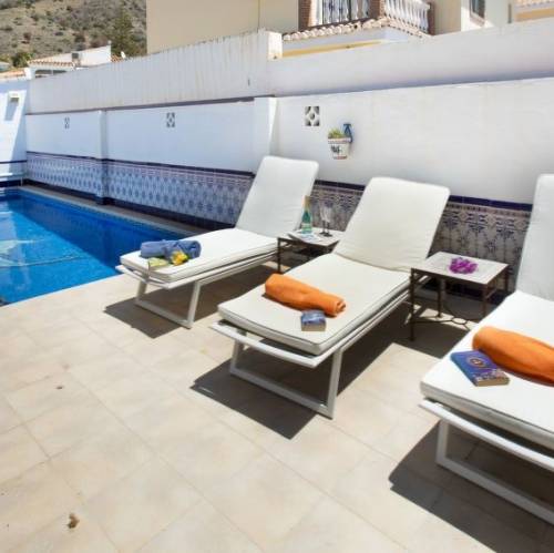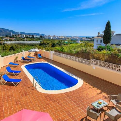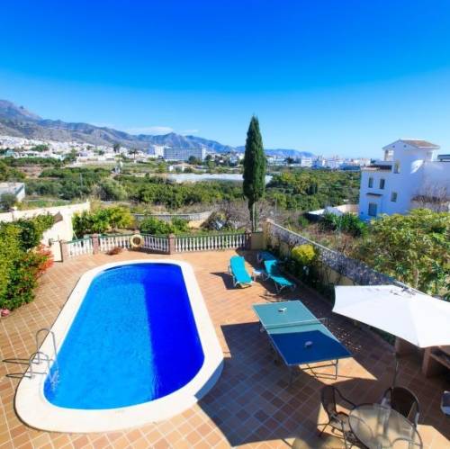 Nerja, EspañaNerja: Villa "Villa Romeral", amplia, bonita de 3 plantas, adosada por un lado. En la periferia, a 2 km del centro de Nerja, lugar tranquilo area residencial (villas), a 2.7 km del mar, a 2.7 km de la playa. Privado: terreno 525 m2 (vallada), piscina en forma de riñon (8 x 4 m, 100 - 200 cm de profundidad, Disponible por temporada: 01.Ene. - 31.Dic.). Ducha exterior, terraza (190 m2), muebles de jardín, barbacoa. En el inmueble: lavadora. Posibilidad de aparcamiento en la calle. Tienda, tienda de comestibles, supermercado 800 m, centro comercial 20 km, restaurante 1 km, bar 1 km, panadería 800 m, café 1 km, alquiler de bicicletas 2 km, parada de autobús "Nerja" 1.9 km, estación de tren "Málaga" 50 km, ferry "Málaga" 50 km, playa de arena 2.7 km, centro de buceo 2.7 km, piscina cubierta 2 km. Puerto deportivo 20 km, puerto para yates 20 km, campo de golf (18 hoyos) 20 km, escuela de surf 20 km, escuela de vela 20 km, tenis 2 km, centro ecuestre 500 m, polideportivo 2 km, rutas de senderismo desde la casa, caminos para bicicletas 500 m, pistas de esquí 70 km. Atracciones en los alrededores: Playa de Burriana.Parques infantiles. 2.7 km, Restaurantes, bares. 1 km, Zona de actividades acuaticas. 2.7 km, Rutas de senderismo. 500 m, Campo de golf a 15 min en coche 20 km, Piscina climaticida pública 2 km. Zonas de esquí populares fácilmente accesibles: Sierra Nevada in Granada 70 km. Lagos conocidos fácilmente accesibles: Viñuela en Velez-Málaga 20 km. Zona de senderismo Montañas de Almijara 500 m. A tener en cuenta: equipamiento para bebés (incluido). El propietario no acepta grupos de adolescentes/jóvenes. Carga y descarga de equipaje posible en la casa de vacaciones. "Romeral", casa pareada 7 estancias 220 m2 en 3 plantas. Espacioso y luminoso, con mobiliario funcional y confortable: salón-comedor con TV digital, canales internacionales, pantalla plana, DVD, calefacción eléctrica y ventilador. Salida pérgola, a la terraza-jardín, a la piscina. 1 dorm. con 2 camas (90 cm, 190 cm de longitud), ventilador. 1 dorm. con 1 cama doble (150 cm, 190 cm de longitud), aire acondicionado y ventilador. Cocina (4 fogones, horno, lavavajillas, tostadora, hervidor de agua eléctrico, microondas, congelador, cafetera eléctrica). Baño/bidet/WC, ducha/WC, WC separado. En planta inferior: comedor. 1 dorm. con 3 camas (90 cm, 190 cm de longitud), aire acondicionado. 1 dorm. con 1 cama de matrimonio (135 cm, 190 cm de longitud), aire acondicionado. Rincón-cocina). Ducha/WC. Planta superior: 1 dorm. con 2 camas (90 cm, 190 cm de longitud), ventilador. Terraza-jardín. Muebles de terraza, barbacoa, tumbonas (9). Espléndida a las montañas. El alojamiento dispone de: lavadora, caja fuerte, plancha, trona, cuna hasta 3 años, secador de pelo. Internet (Wifi, gratis). A tener en cuenta: detector de humo. Villa adaptada para usuarios de silla de ruedas. Puertas con ancho especial y un cuarto de baño con ducha completamente adaptado. No hay escaleras en toda la casa principal, terraza o piscina. Hay un apto. con acceso independiente debajo de la casa principal. En el apto. hay dos dormitorios, uno con cama de matrimonio y otro con tres camas individuales, los dos tienen aire acondicionado. El propietario de la casa no acepta grupos de jovenes o adolecentes. VFT/MA/49398