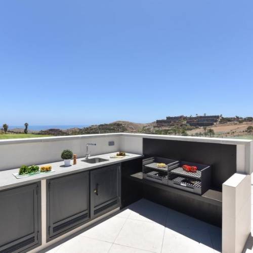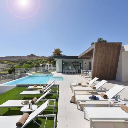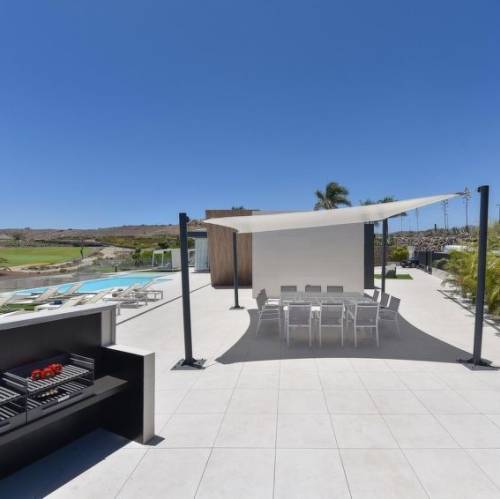 San Bartolomé de Tirajana, EspañaVilla, de nueva construcción, moderna, lujosa "Sunset Villa Salobre" del año 2020. Equipamiento de la vivienda: aire acondicionado, lavadora (privado), secadora (privado). Parking: parking al lado de la vivienda. Acceso en coche todo el año. Situación: en el centro de Salobre Golf Resort, en la periferia de Maspalomas, lugar aislado, tranquilo, soleado. Vista desde la vivienda al valle y al bosque. Entorno de la vivienda: terreno (privado), piscina (privado), barbacoa (privado). Climatización de la piscina: extra (80€/noche, a solicitar en la reserva y a pagar en plaza). "Sunset x 10", casa independiente, 9 piezas para 10 personas, 480 m2 en 2 plantas, con mobiliario moderno y lujoso. Salón con TV satélite. Fumar no permitido. Internet (Wifi). Dormitorio con 1 cama doble. Dormitorio con 1 cama doble. Dormitorio con 1 cama doble. Dormitorio con 2 camas dobles. Cocina con 4 quemadores, microondas, horno, mesa de comedor, lavavajillas, frigorifico y congelador. Bidet. Balcón, terraza, terraza-jardín, muebles de terraza. Otros equipamientos: caja fuerte, trona, secador de pelo, plancha, lavadora, secadora. 2020/75585