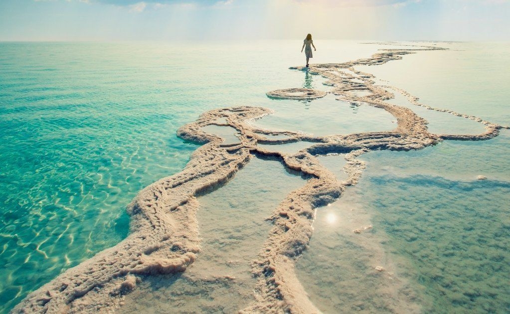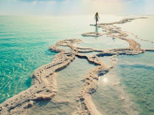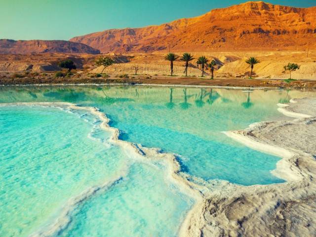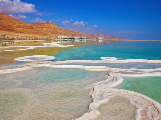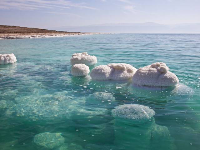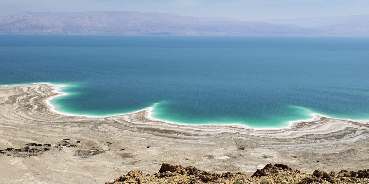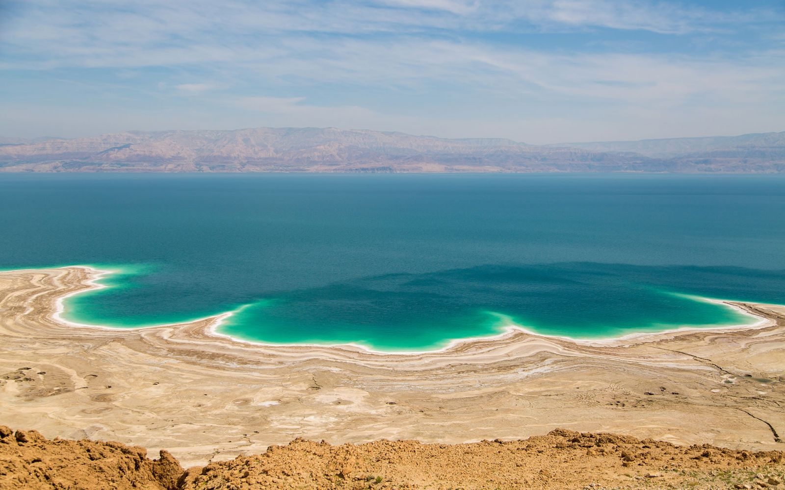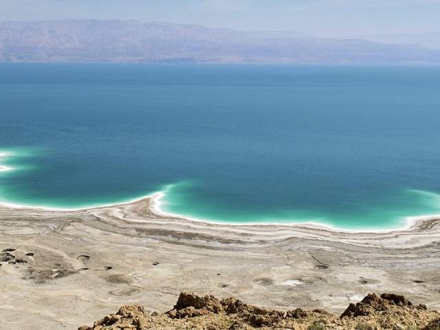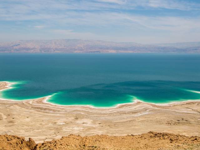 El Mar Muerto tiene su costa oriental en Jordania . Es el punto más bajo del mundo a 394,6 m (1269 pies) debajo del nivel del mar. El agua en el Mar Muerto es extremadamente salada, y se ha estimado que es el segundo cuerpo de agua más salado del mundo. Su nombre se deriva del hecho de que el agua está demasiado salina para la habitación marina. El Mar Muerto es naturalmente endorreico (sin corrientes de salida) con el río Jordán como su única...más
