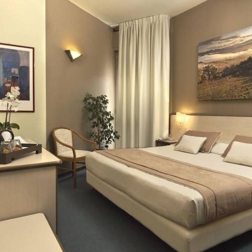 Montecatini-Terme, ItaliaEl hotel está situado en una tranquila y frondosa calle, a sólo 5 minutos a pie del centro de la ciudad y de la estación de tren, desde donde se pueden coger trenes a Florencia y Pisa. Situado en la pintoresca ciudad balneario de Montecatini Terme, es una base perfecta desde la que explorar las ciudades y el campo de la hermosa Toscana. El hotel mezcla el estilo italiano contemporáneo con el encanto tradicional toscano. Las luminosas habitaciones alicatadas y los balcones y terrazas con vistas a la ciudad y las montañas de los alrededores crean un ambiente de tranquilidad y paz.