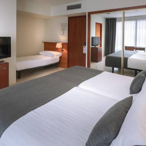 Castelldefels, EspañaEste hotel está situado al sur de Barcelona, el centro se encuentra a 15 kilómetros. En los alrededores podrá encontrar numerosas tiendas y comercios, restaurantes y bares. La playa se encuentra a 1500 metros y hay una estación de autobuses a 10 minutos. El aeropuerto de Barcelona está a una distancia de 7 kilómetros.Este elegante hotel, construido en el año 2005, tiene cinco plantas en las que se reparten un total de 177 habitaciones, 9 de ellas suites y 4 apartamentos. Ofrece a sus huéspedes numerosas ventajas, como el elegante hall de entrada con recepción abierta las 24 horas del día, caja fuerte, guardarropa y ascensores. Las comidas y bebidas se sirven en el bar, en la pequeña cafetería o en el restaurante climatizado. Además, tiene a su disposición conexión a Internet. Para la gente que viaje por motivos de negocios, hay diferentes salas de conferencias. Para completar todas estas prestaciones, también dispone de servicio de habitaciones y de lavandería. Podrá aparcar su vehículo en el aparcamiento del propio hotel. Las habitaciones del hotel, decoradas y amuebladas con buen gusto, disponen de baño con secador de pelo. Cada una de las acogedoras habitaciones está equipada con teléfono de línea directa, televisión vía satélite o por cable y conexión a Internet. También cuentan con caja fuerte de alquiler, cama extra grande y calefacción central.En el recinto exterior del hotel podrá encontrar una piscina. Está rodeada de una terraza para tomar el sol, dotada de tumbonas y de sombrillas.El hotel dispone de un fantástico restaurante con cocina mediterránea y de estilo propio. Deje Barcelona por la Plaça Espanya y Gran Via dirección Tarragona o Sitges; Siga las indicaciones de Tarragona o Sitges por la autopista C-32; Siga por la C-32 y tome la salida 46 (Canal Olímpic). El hotel se encuentra al lado derecho de la salida 46.