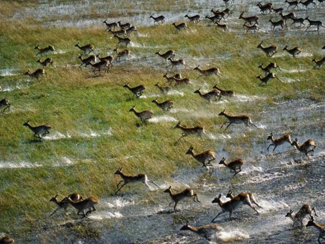 En el delta del Okavango existe la única población de leones nadadores; éstos se ven forzados a entrar en el agua, que durante las crecidas llega a cubrir el 70% de su territorio, para cazar antílopes como los impalas.